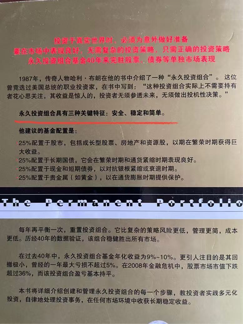 $华夏黄金ETF联接A(OTCFUND|008701)$前面6期稳稳读书分别是,…,06期哈利布朗永久组合策略参与经典稳健配置策略对比,看哪个更适合普通投资者呢?/可翻阅上期见答案。今天07期就继续背封面的哈利永久组合的三种关键特性;