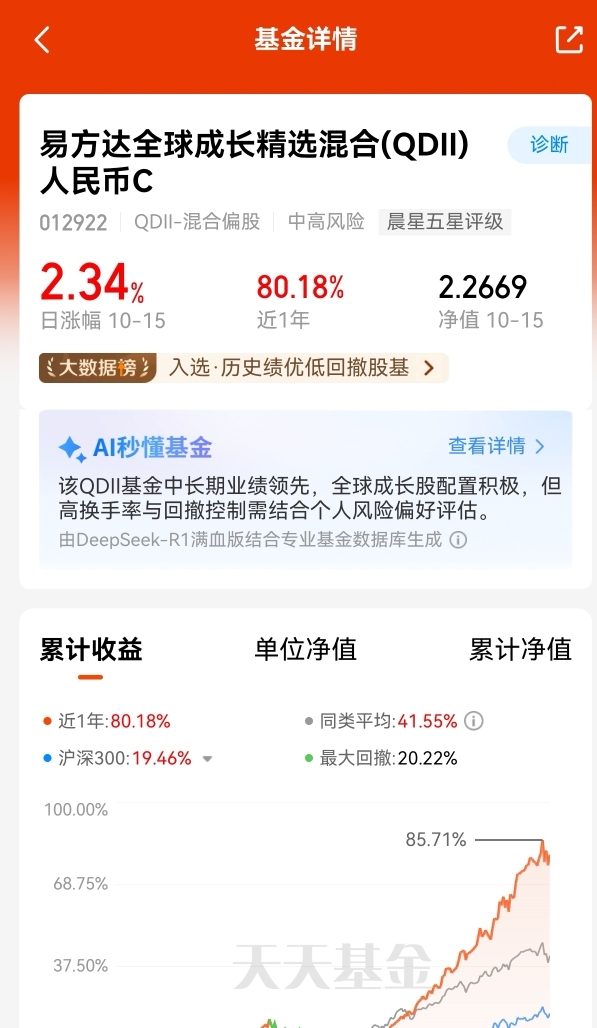 大盘震荡调整,今日还是补补仓,$易方达全球成长精选混合(QDII)人民币C$ 这只基金是全球范围选股,可以同时把握多个市场的科技成长机会,基金经理对市场的把握也比较精准,一季度重仓港股,跟上了港股估值修复行情,二季度重仓美股科技,又跟上了美股不断创新高的行情,近三个月+34.76%,同类第四,近六个月+75.85%,同类第4,业绩优秀赚钱能力强啊。