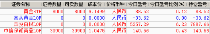 牛市里主要防踏空,而不是套牢,牛市里的最佳策略是满仓死捂,而不是总想着逃顶。但是炒股和一个人的性格有关,俗话说,江山易改,本性难移,比如我就有多动症,总喜欢瞎折腾的,一天不买卖就难受,怎么办呢?老生常谈,纪律,还是纪律!我给自己定的纪律,在牛市里,日常始终要保持重仓状态,一直到行情出现真正的拐点后再考虑清仓,在这之前不去猜顶和逃顶!收盘时,国投白银浮盈2195元。