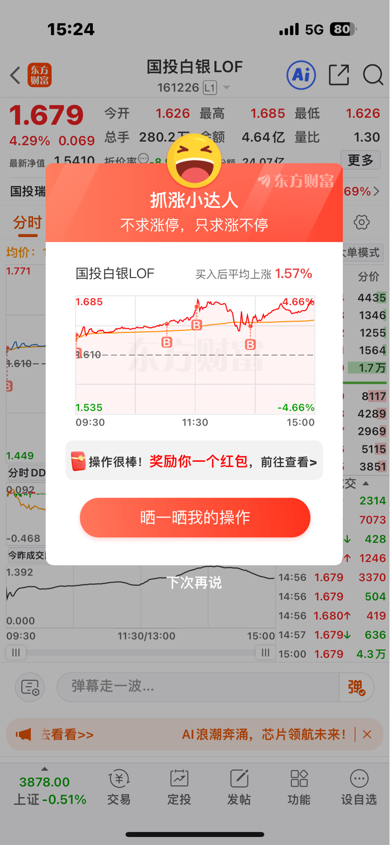 $国投白银LOF(SZ161226)$ 今天一天不是加仓就是在加仓的路上,别我一买你就跌,今天晚上白银给我冲60,明天高开冲高让我跑,短波段收益让我再吃一个