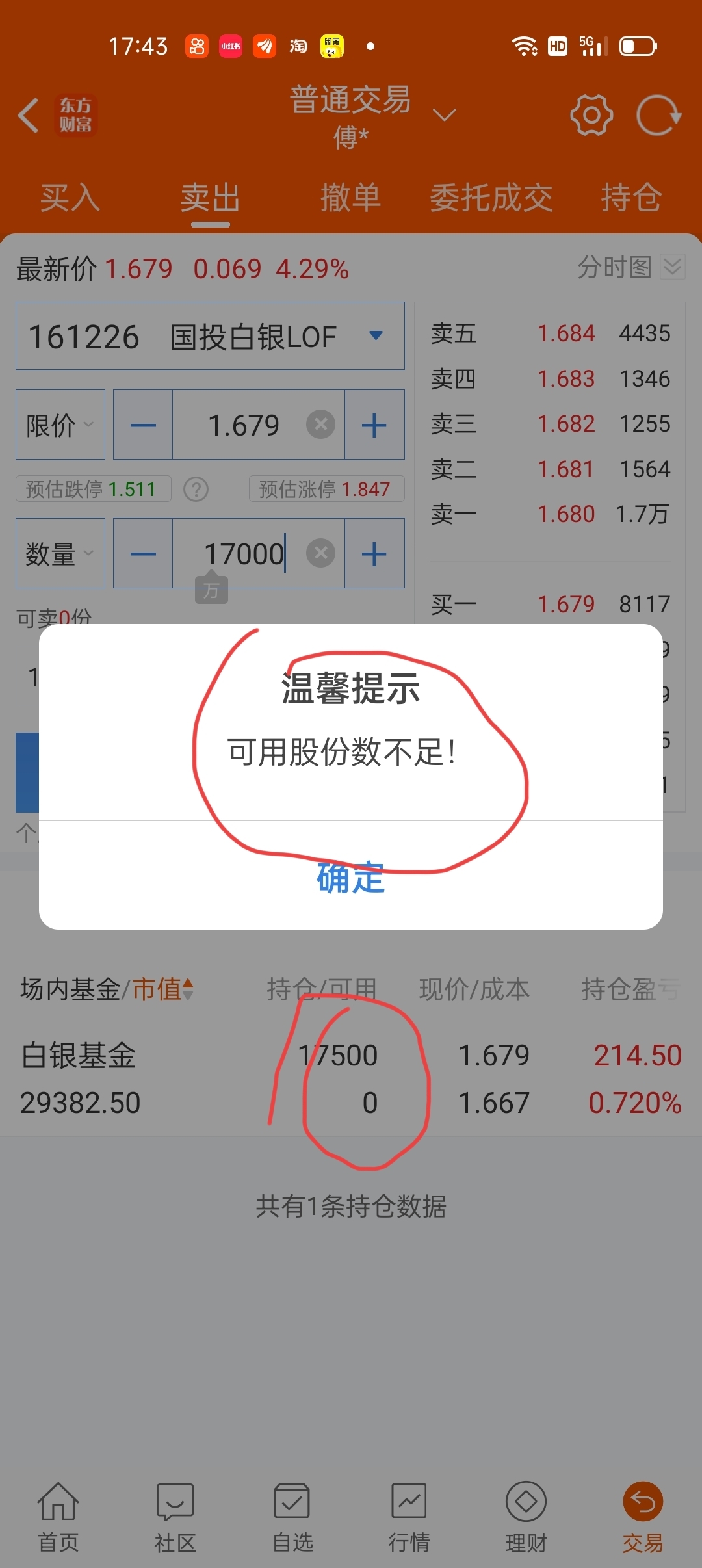 各位大神,今天差不多收盘时,场内国投白银lof,持仓有一万,可用为零,这是怎么回事?想卖卖不出去