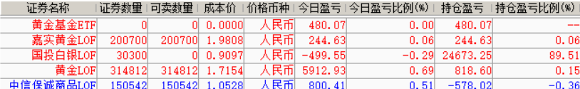 前几天有人看中了湖南白银,而有人依然坚守着国投白银,事实证明最近小强它比股票还厉害,简直涨疯了!比如,本周国投白银累计涨幅为12.84%,而湖南白银本周累计涨幅才4.15%,短期内二者差了8.69%。同样的情况,本周黄金ETF累计涨幅为0.76%,三只LOF基金涨幅分别为,黄金主题0.8%,汇添富黄金1.06%,嘉实黄金0.81%,再看个人自选股里的湖南黄金,本周它还倒跌了3.25%,渣渣,贵研铂业也不咋地,微跌0.28%,这也是我不愿意买股票的原因,连黄金和白银本体都跑不赢,而且股票还有一系列的因素需要考虑,忙了半天收益还不怎么样,不如直接去买ETF或LOF基金。