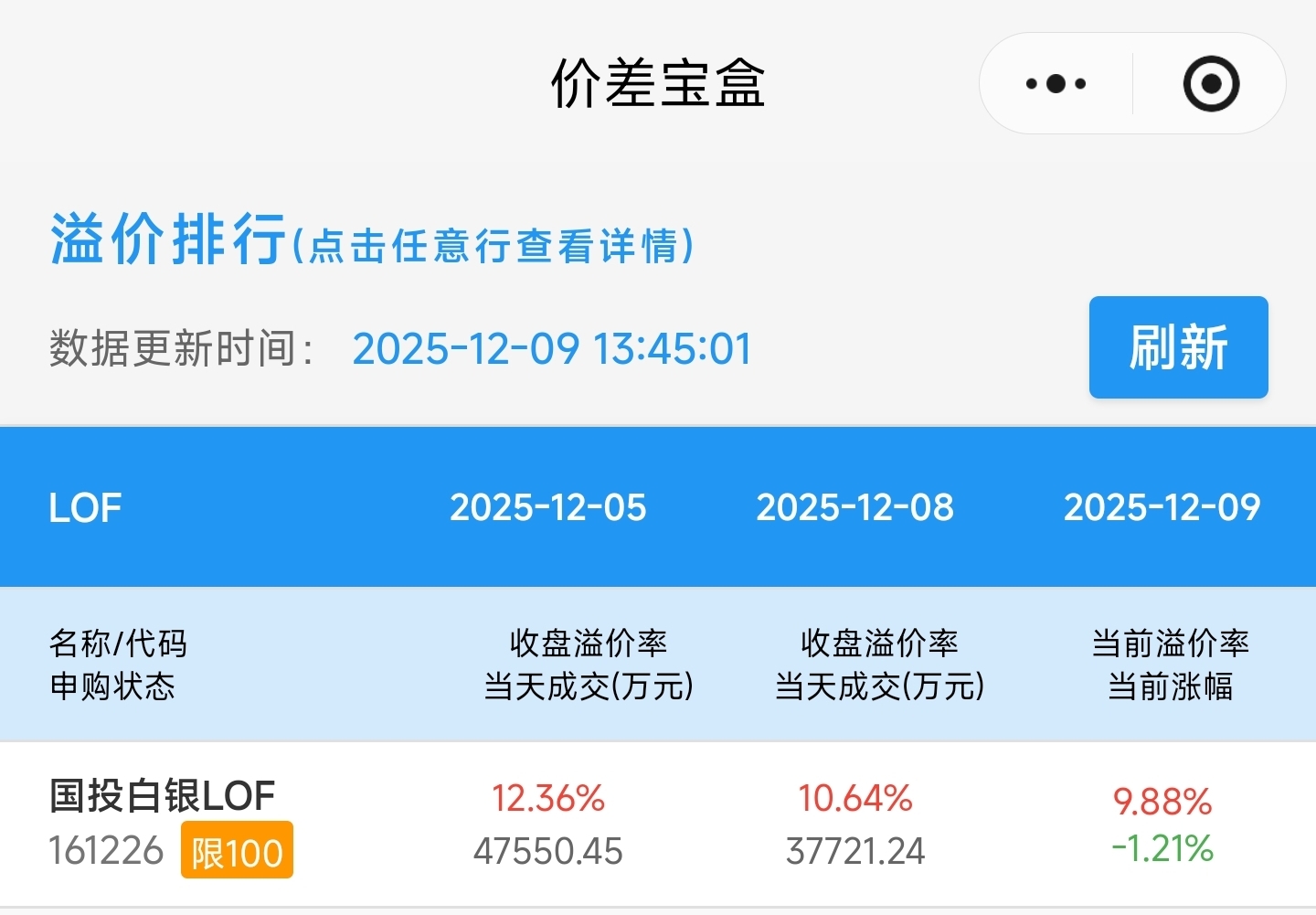 $国投白银LOF(SZ161226)$ 国投白银溢价率跌破10%,仅剩9.88%了!988,就发发!