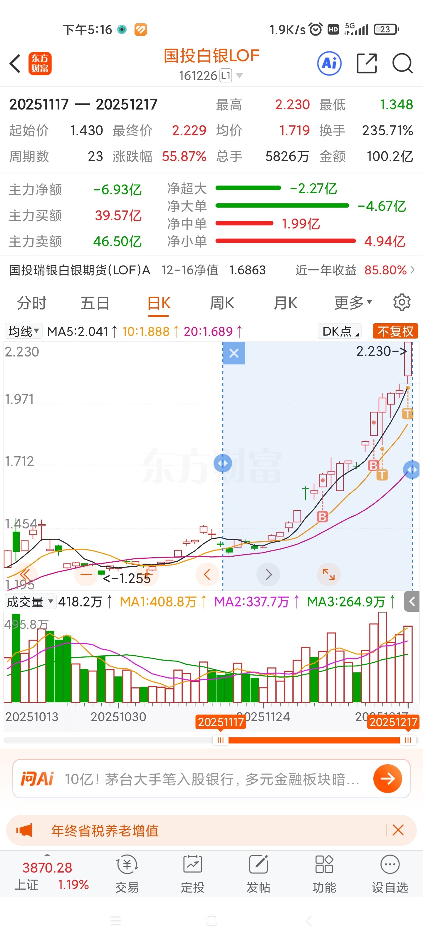 $国投白银LOF(SZ161226)$ 这一个月对比一下黄金和白银的区别, 哎,被黄金耽误了,累死累活做t,选择比努力重要,白银可以用疯狂来形容,同样一个月拿着不动黄金涨3个点不到,白银涨幅高达55个点,离谱