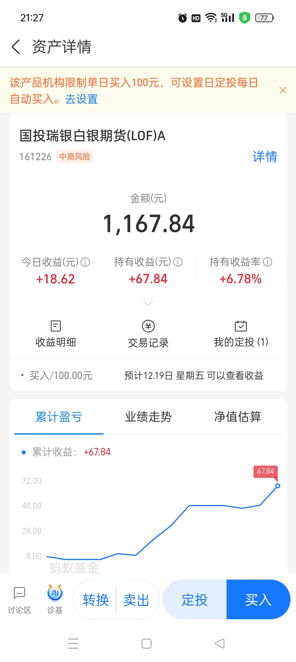 为什么今天涨停,而我支付宝1100元,只涨了18元,按理应该有100元左右啊,真