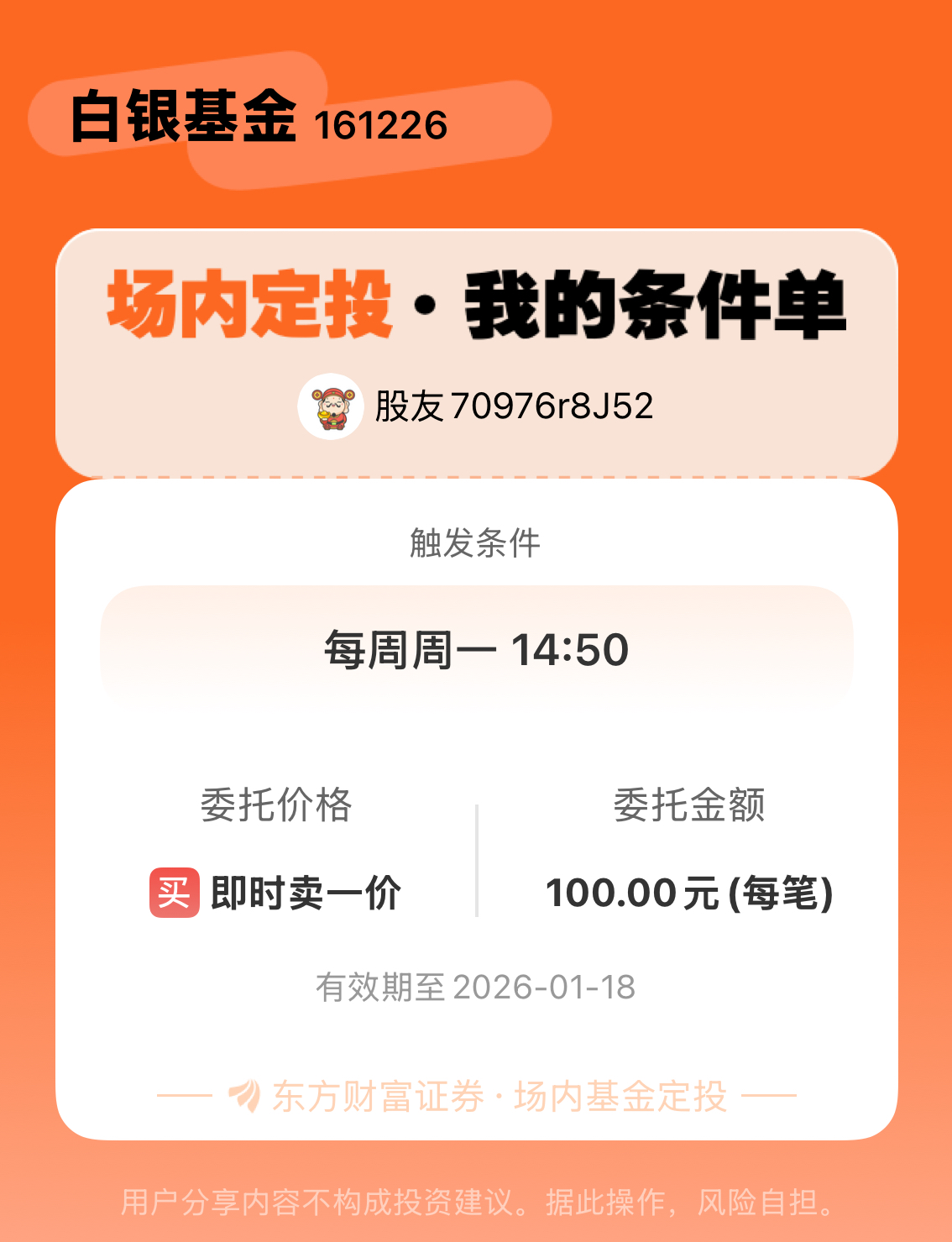 #条件单交流# #场内定投晒单# 一位股神设置了一个场内基金定投条件单,接下来就是见证奇迹的时刻~$白银基金(SZ161226)$