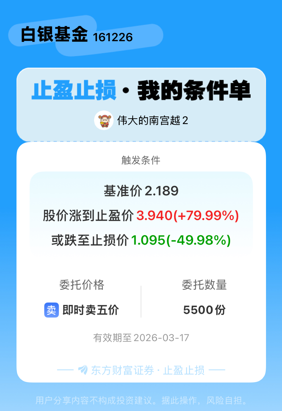 #条件单交流# #止盈止损晒单# 一位股神设置了一个止盈止损条件单,接下来就是见证奇迹的时刻~$国投白银LOF(SZ161226)$