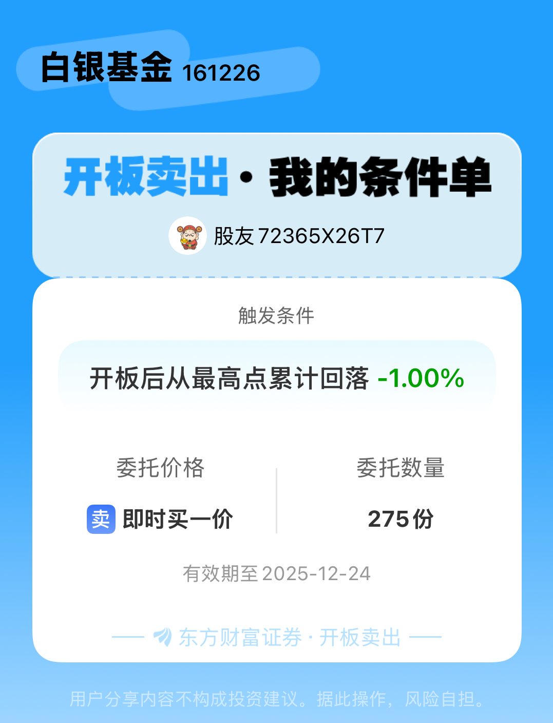 #条件单交流# #开板卖出晒单# 一位股神设置了一个开板卖出条件单,接下来就是见证奇迹的时刻~$白银基金(SZ161226)$