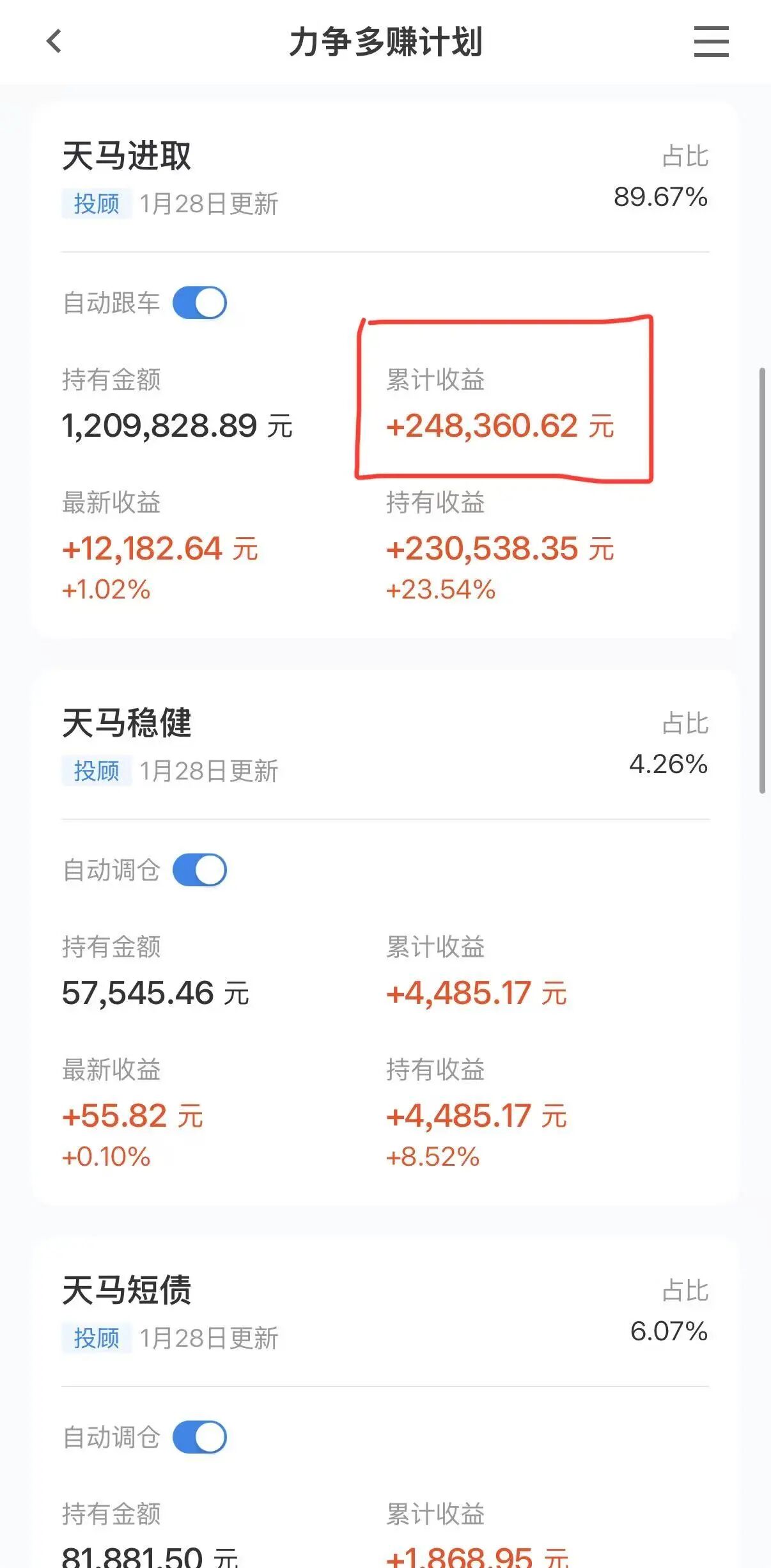 截止昨天(1月28日),我的实盘示范账户中所定投的天马进取组合,盈利约24.8万元,盈利比例约25.7%。