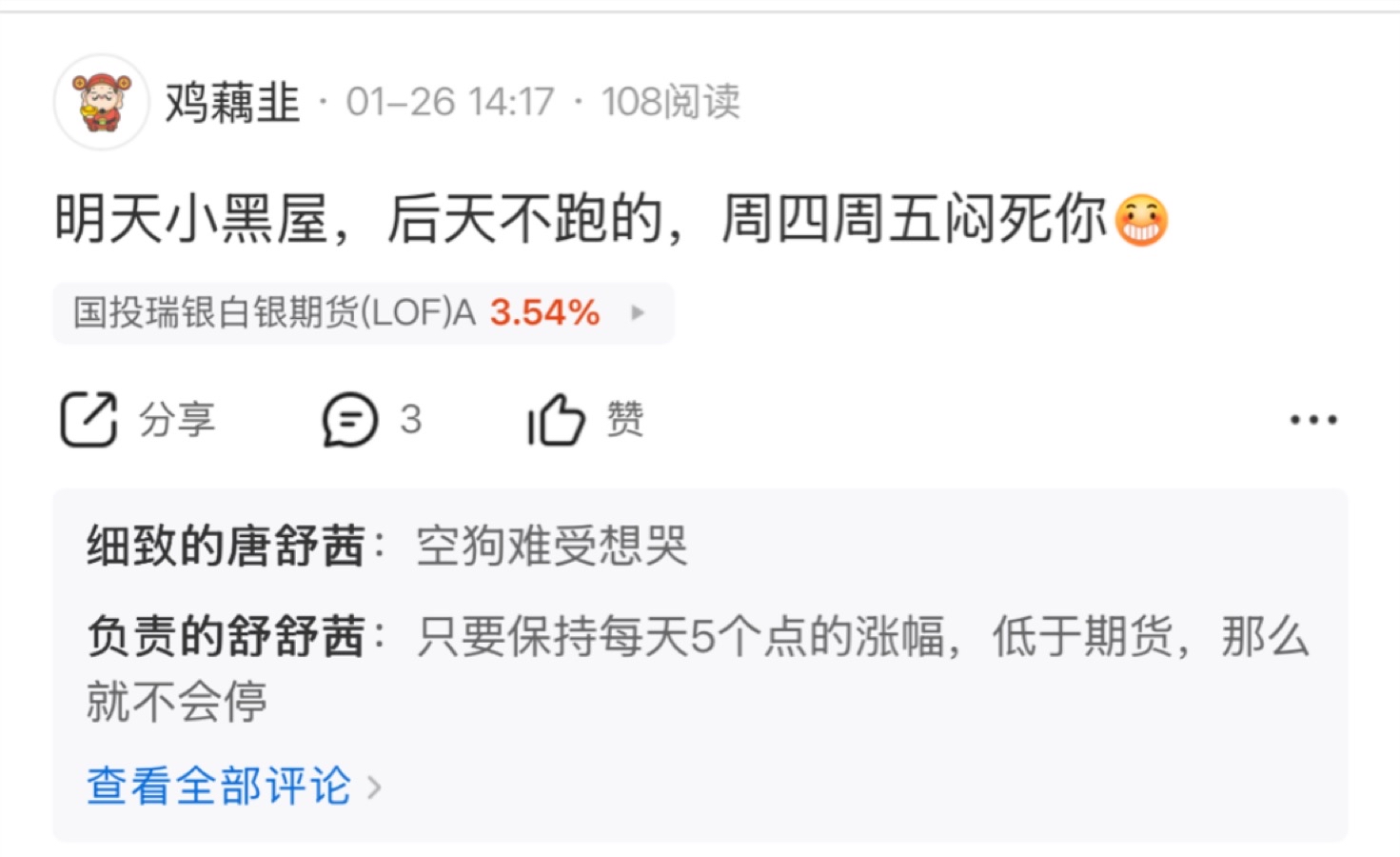 郑重声明:用户在基金吧/财富号/股吧等社区发表的所有信息(包括但不限于文字、视频、音频、数据及图表)仅代表个人观点,与本网站立场无关,不对您构成任何投资建议,据此操作风险自担。请勿相信代客理财、免费荐股和炒股培训等宣传内容,远离非法证券活动。请勿添加发言用户的手机号码、公众号、微博、微信及QQ等信息,谨防上当受骗!