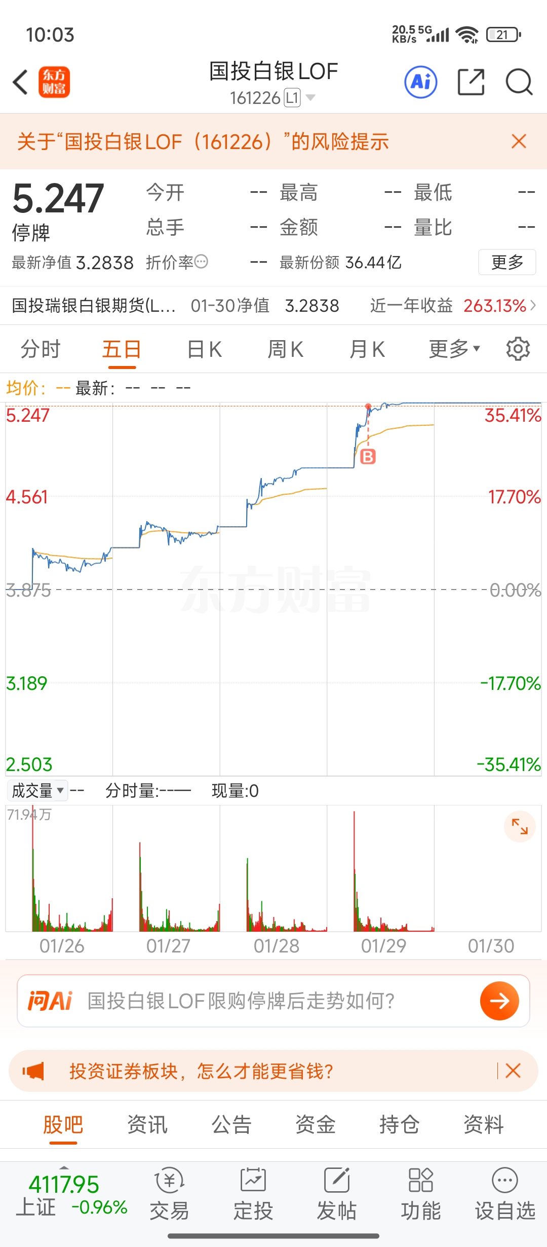 $国投白银LOF(SZ161226)$ 愿赌服输,本来想吃一个涨停就撤,谁知道是最后一个接盘的。白银短期内不会在涨到120了,但后续会涨涨跌跌,多头挂了这么多人谁去给多头解,周一涨不上就基本凉凉了,几个月或者一年或者更久