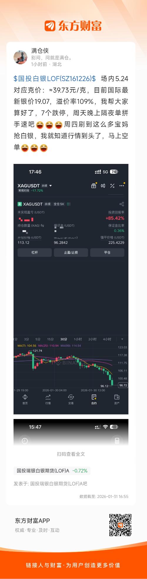 $国投白银LOF(SZ161226)$ 场内5.24对应克价:≈39.73元/克,目前国际最新银价19.07,溢价率109%,我帮大家算好了,7个跌停,周天晚上隔夜单拼手速吧