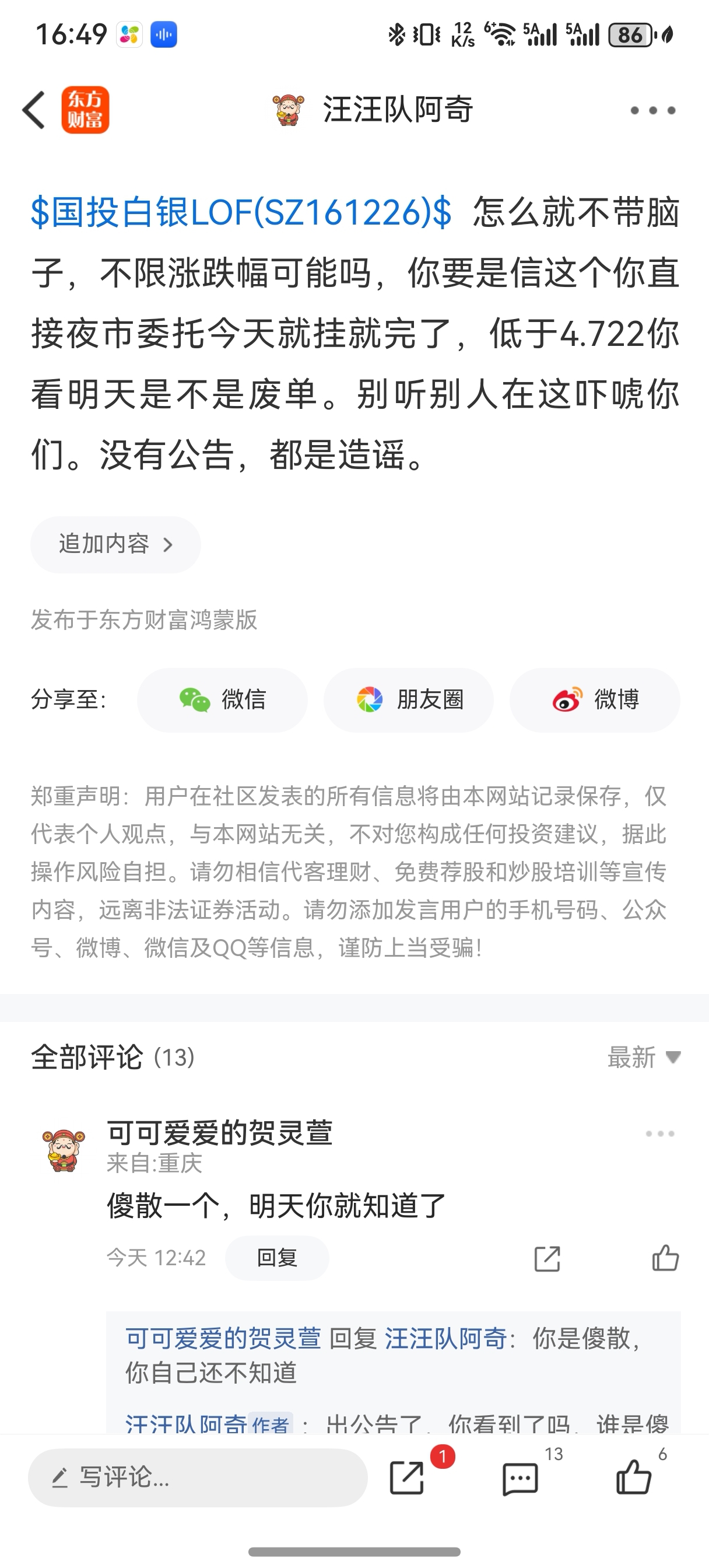 温馨提示: 1.根据《证券法》规定,禁止编造、传播虚假信息或者误导性信息,扰乱证券市场;2.用户在本社区发表的所有资料、言论等仅代表个人观点,与本网站立场无关,不对您构成任何投资建议。用户应基于自己的独立判断,自行决定证券投资并承担相应风险。《东方财富社区管理规定》