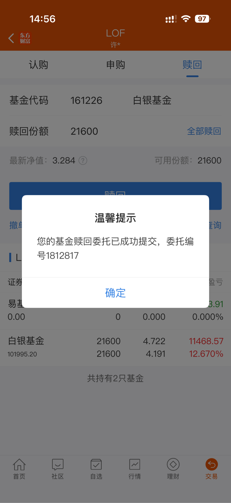 $国投白银LOF(SZ161226)$ 盘中赎回的时候盘后后悔了怎么办