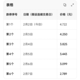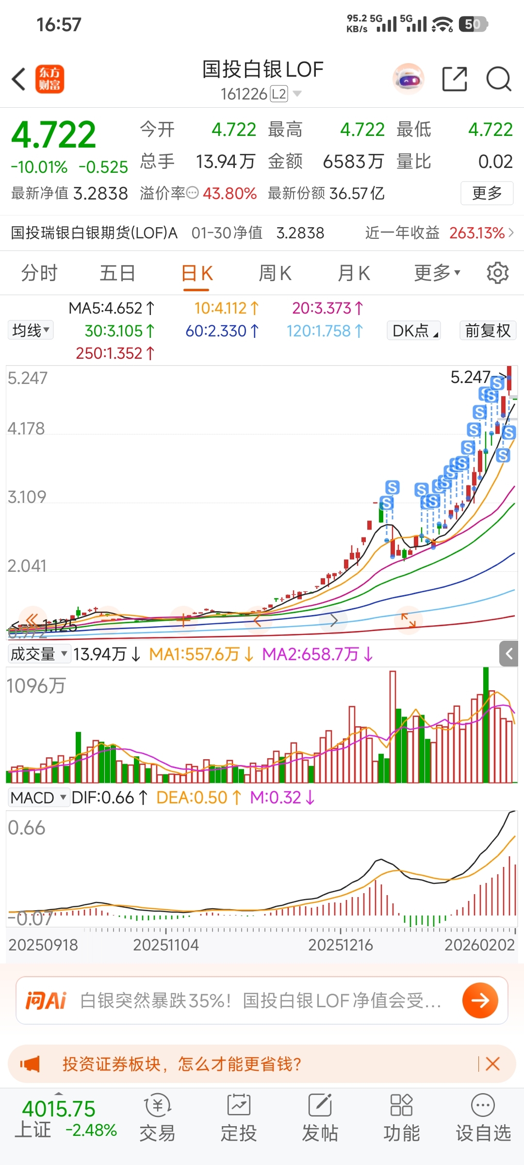 $国投白银LOF(SZ161226)$$国投瑞银白银期货(LOF)A(OTCFUND|161226)$为什么说今天赎回的是大聪明?看一下连续六个跌停板的价格就知道了:今天按基金净值赎回价应该是2.8263,目前场内价格是4.722,要再来五个连续跌停(不包括今天)才会到今天的赎回价附近,不然都是场内卖划算。除非你认为场内可以连续六个跌停以上,或者你的持仓成本足够低无所谓