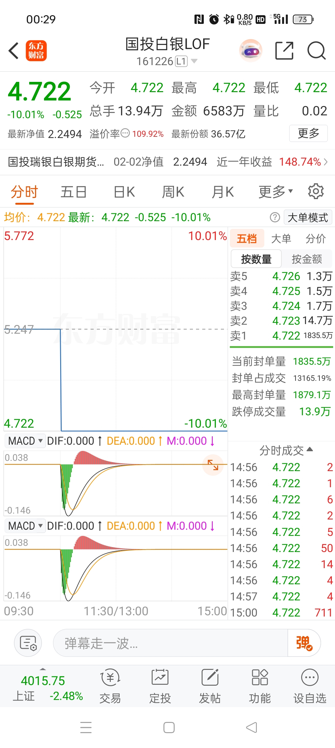 $国投白银LOF(SZ161226)$ #黄金白银双双暴跌,贵金属后市何去何从?# $贵金属(BK0732)$ 的甘,这109%的溢价。真实净值只有2.24。这溢价平了哪里还有人啊