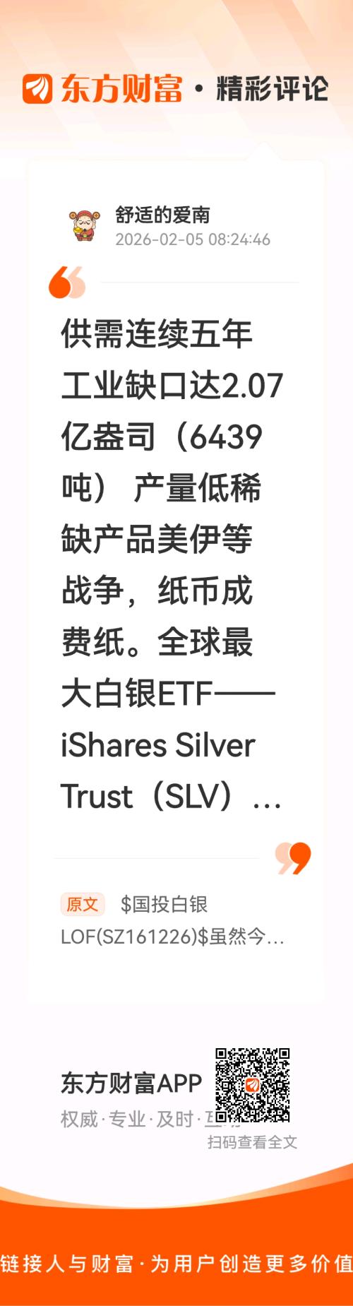 //@舒适的爱南 :供需连续五年工业缺口达2.07亿盎司(6439吨) 产量低稀缺产品美伊等战争,纸币成费纸。全球最大白银ETF——iShares Silver Trust(SLV)2026.2.2单日增持白银为1023.23吨。银价涨幅超黄金,持续看涨。