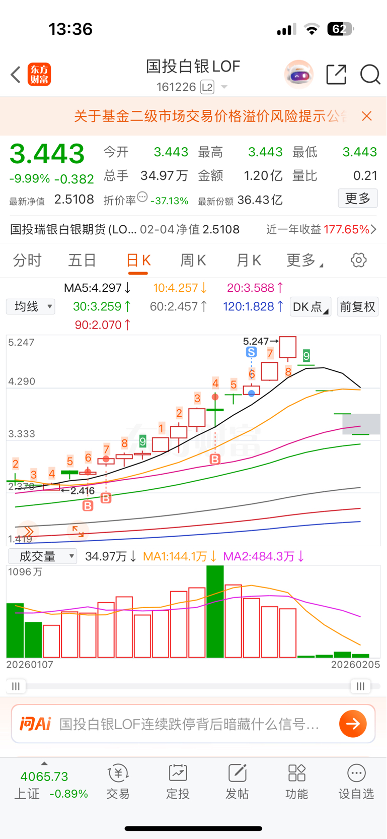 $国投白银LOF(SZ161226)$ 明天继续跌停。早在周一的时候已保守预估本周都是跌停。可偏偏就是有人不认可,不接受这个事实。第一个铜板与最后一个铜板往往都是很贵的。#复盘记录# #收盘点评# #炒股日记# #投资干货#