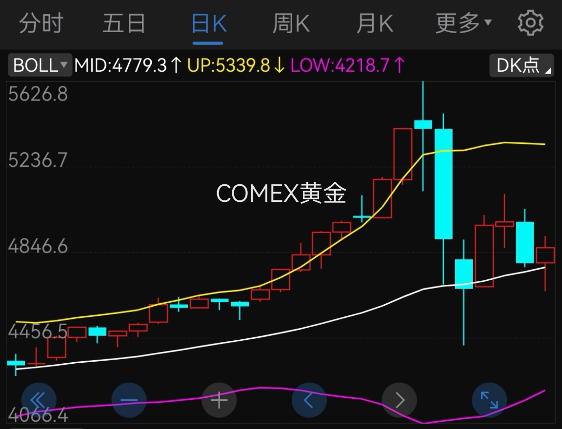 周五早上一觉醒来,圆兔发现COMEX黄金已回调到布林中轨下方再重上布林中轨。