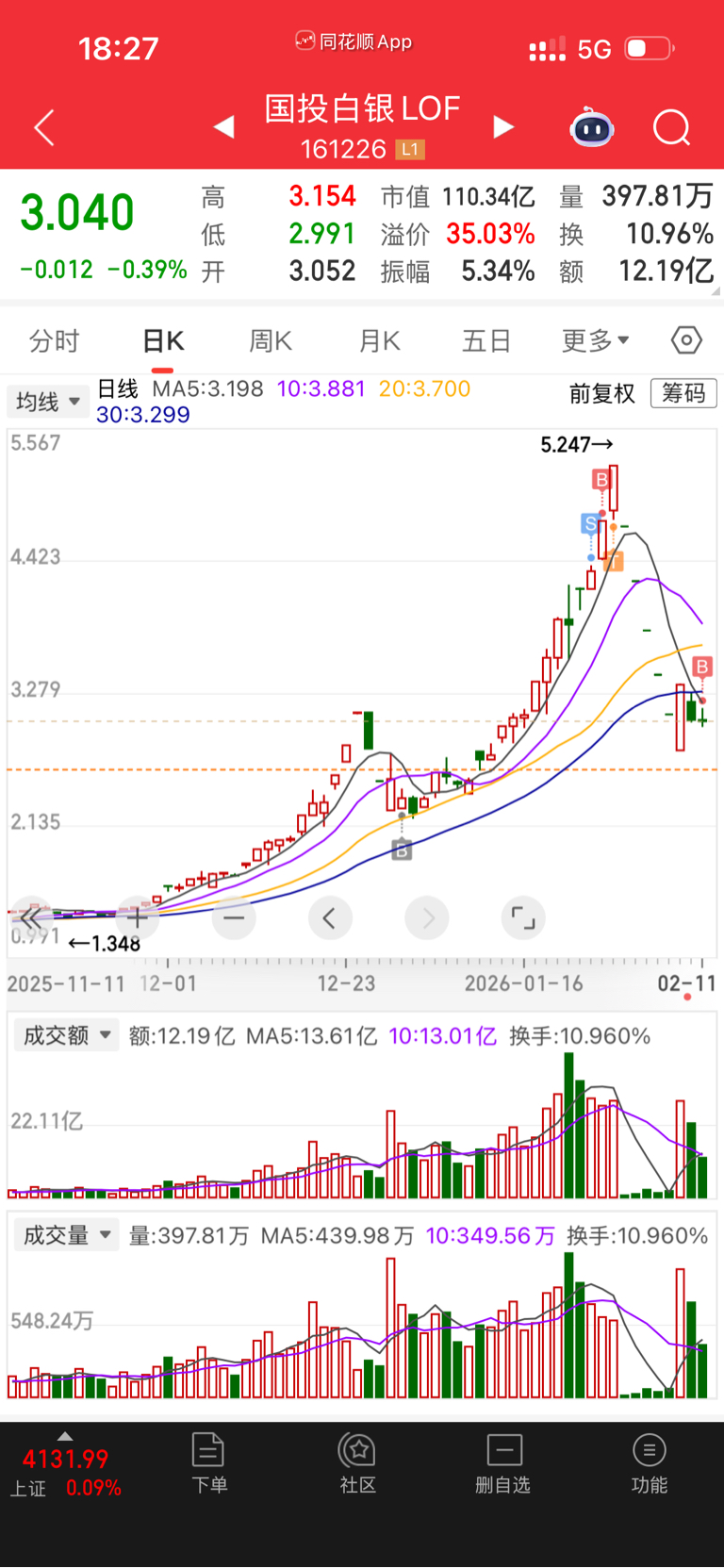 $国投白银LOF(SZ161226)$ 不管怎么跌,就是不跑,国内买银只有这个通道,外面实物溢价也快30了,你敢跌我就敢加仓