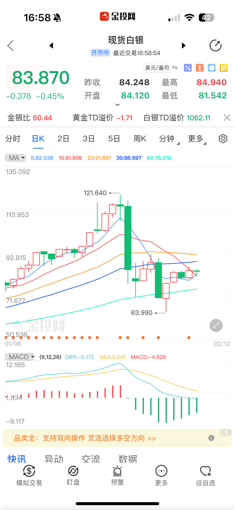 $国投白银LOF(SZ161226)$ 持股过年,大盘5日线马上上穿10日线了,也该企稳了,大盘从120美元回调到最低60多美元,短期暴力回调了百分之50必然会有反弹,白银26年依然短缺,不会这就结束的,套住的也别怕,别让唱空的吓住了,昨天美国非农数据大利空金银都没砸下去,如果昨天非农利好的话肯定起飞了。