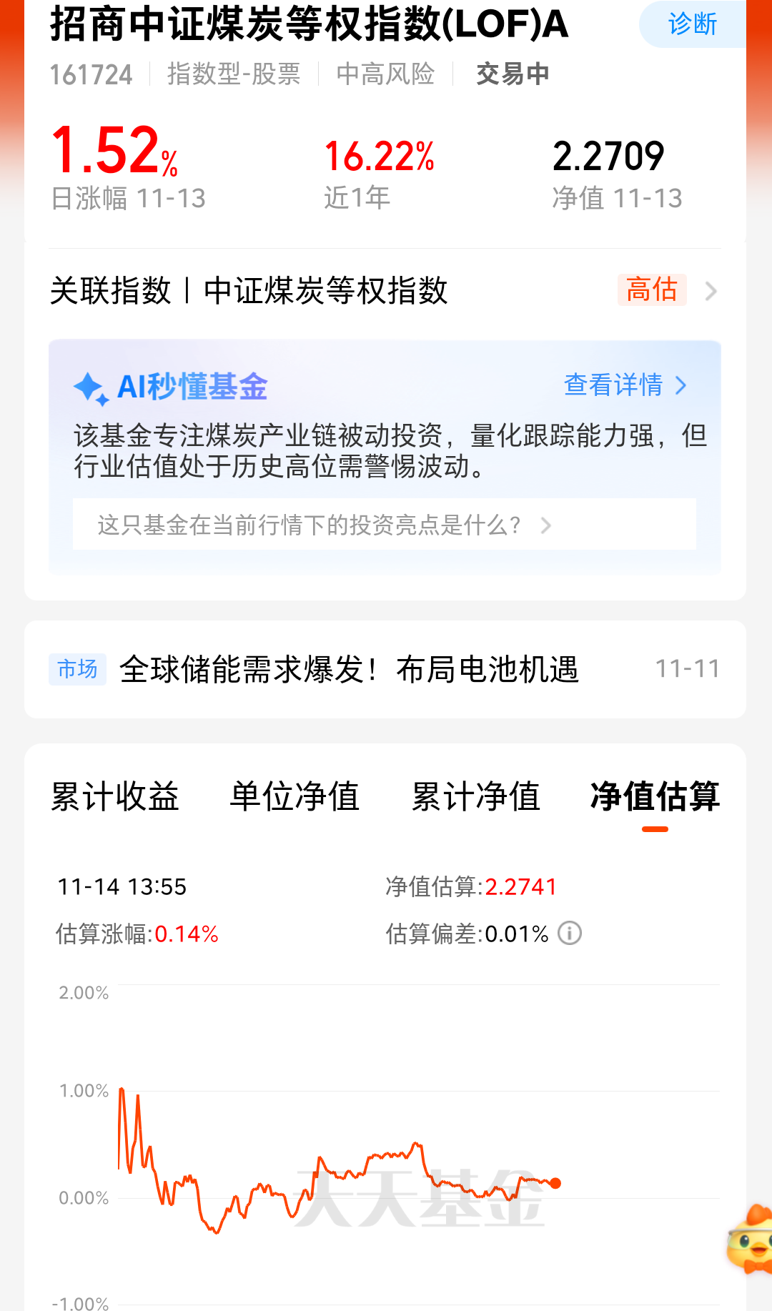 昨天股市行情反弹,沪指又创新高。今天行情调整。但是每天板块还在继续上涨。$招商中证煤炭等权指数(LOF)A(OTCFUND|161724)$昨天上涨1.52%,今天盘中估值上涨0.14%,在冷冬以及储能概念增强的利好下,我看好第四季度,煤炭板块行情。