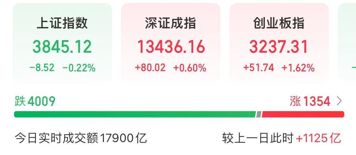 盘面上,截至我发文,上证指数下跌0.22%,深成指数上涨0.60%,创业板指数上涨1.62%
