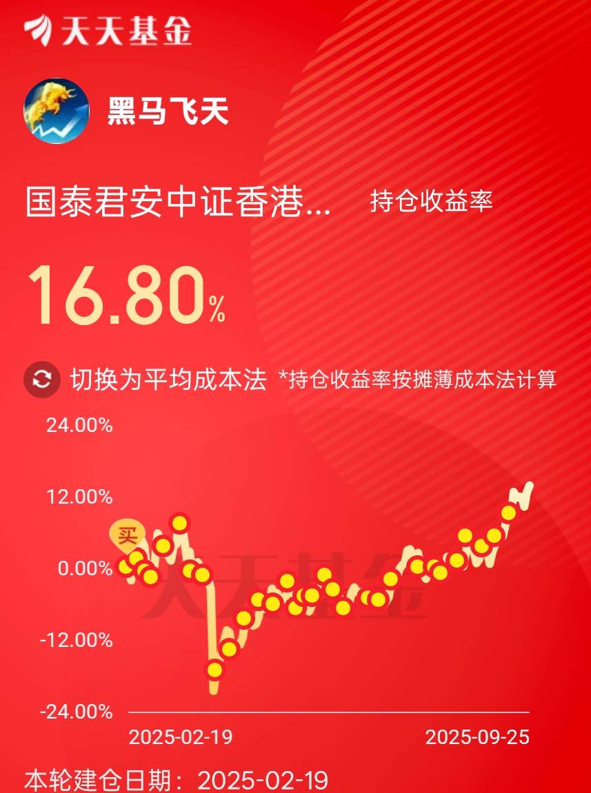 $国泰君安中证香港科技指数发起(QDII)C(OTCFUND|022122)$已定投半年多,目前浮盈16.8%,现在还不到止盈时刻,周定投继续进行,今天再加仓一笔。