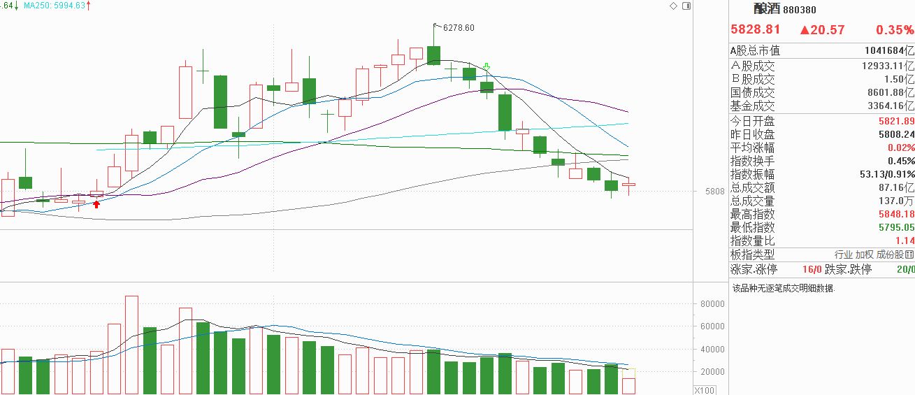 家人们,咱们的眼睛得死死盯住白酒!上周五一度小阳反弹至5天线,当时我还以为5天线已经的抛压已经消除,结果尾盘还是冲高回落甚至还再创新低,这明显不属于止跌企稳的信号。今天白酒高开后探底回升再次测试5天线抛压,按理说自9月24号开始白酒每天都在测试5天线抛压,今天已是第四天了,如果今天无惧5天线出现上行,下周出现一次短线修复是有可能的,由于上方60天线、年线、10天线几乎汇聚在一起,我觉得这个阻力位不容易突破,向上反弹的空间满打满算估计就这样了。要一口气突破年线收复半年线感觉概率不大,如果主力愿意,这处下跌趋势中的小反抽是可以的。这不是顺势而为的表现,做逆势抢反弹的风险挺大,不是我喜欢的风格,如果白酒反抽失败继续下行也是有概率的,对于这种看起来有机会,实际是逆势的情况,我选择观望为主。