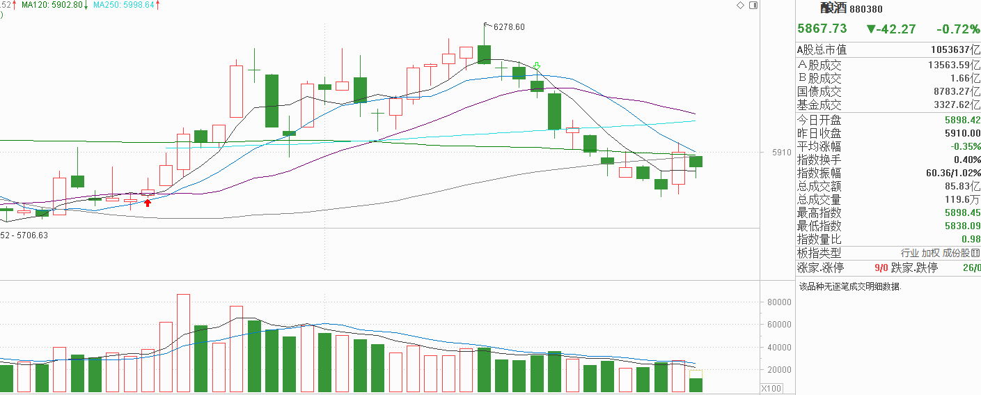 家人们,注意了!白酒昨天干啥了?探底回升中阳反弹至年线上方,我觉得是市场的止跌信号,但能不能企稳还得从今天的市场表现观察。今天白酒低开在年线下方中阴调整,基本把昨天的中阳线反包了,说明昨天进场的资金已经重新套牢,抛压比买盘要大,企稳不代表止跌。我认为白酒要止跌,起码新进场的资金不能一参与就被套牢吧?今天白酒如果无法收复5天线,我会继续以下行走势看白酒,如果能探底回升收复年线,说明承接力度还行,连续三天没有新低,止跌信号就更明显一些。当前的白酒要先止跌,再确认这一次回调震荡的大箱体,箱底在那里,箱顶又在那里,如果认为这个高低切换比当下的主线更靠谱,做价差是没有问题的,但如果已经在主线在吃肉,我认为真没有必要回到白酒等待还没有企稳的下行趋势,这样性价比太低。