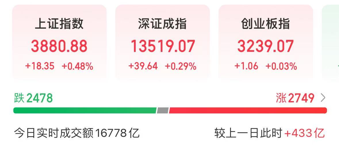 盘面上,截至我发文,上证指数上涨0.48%,深成指数上涨0.29%,创业板指数上涨0.03%
