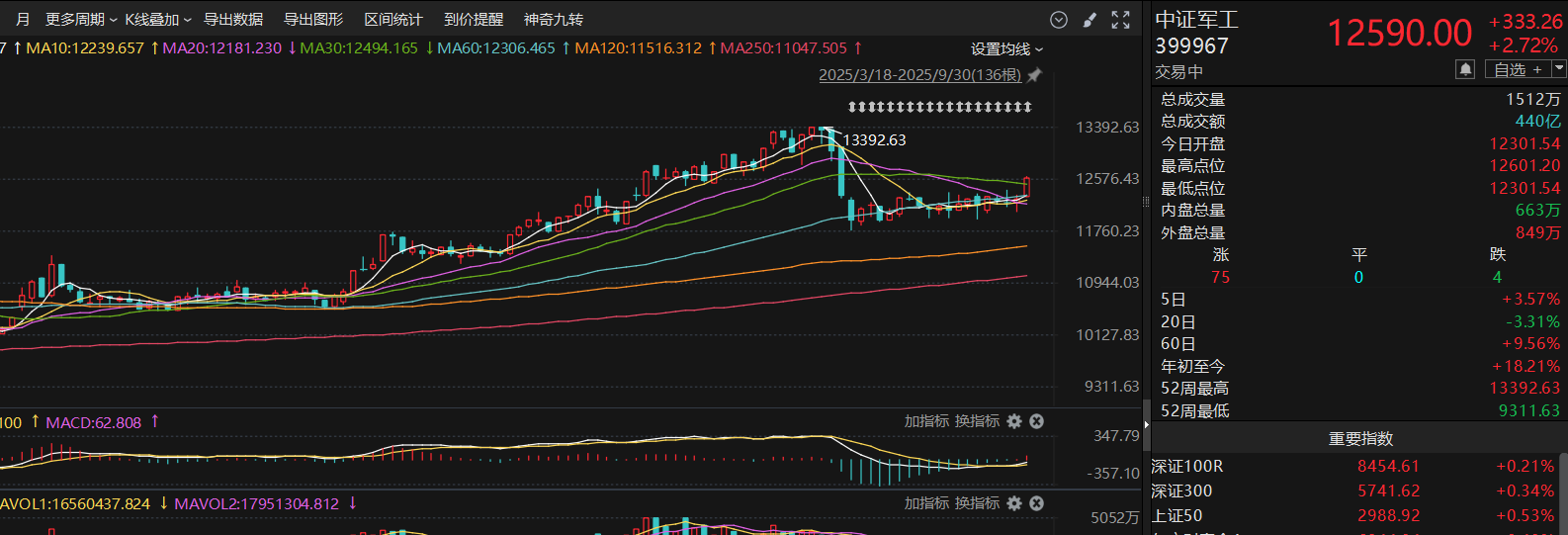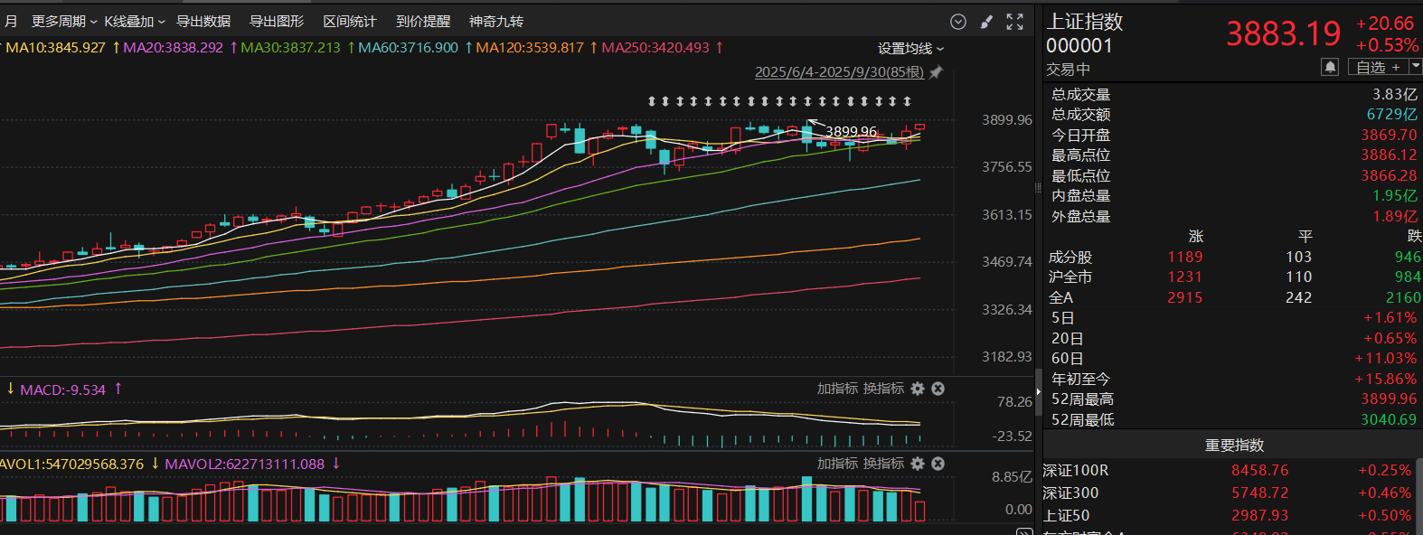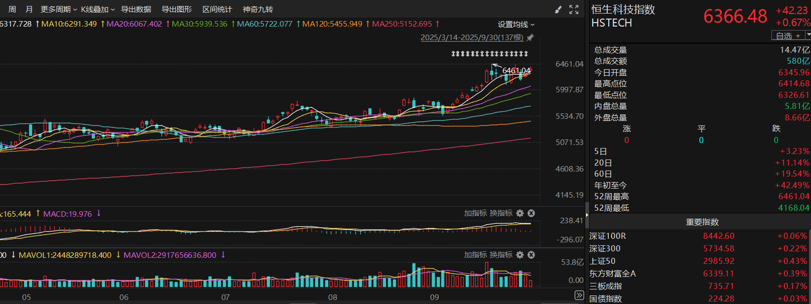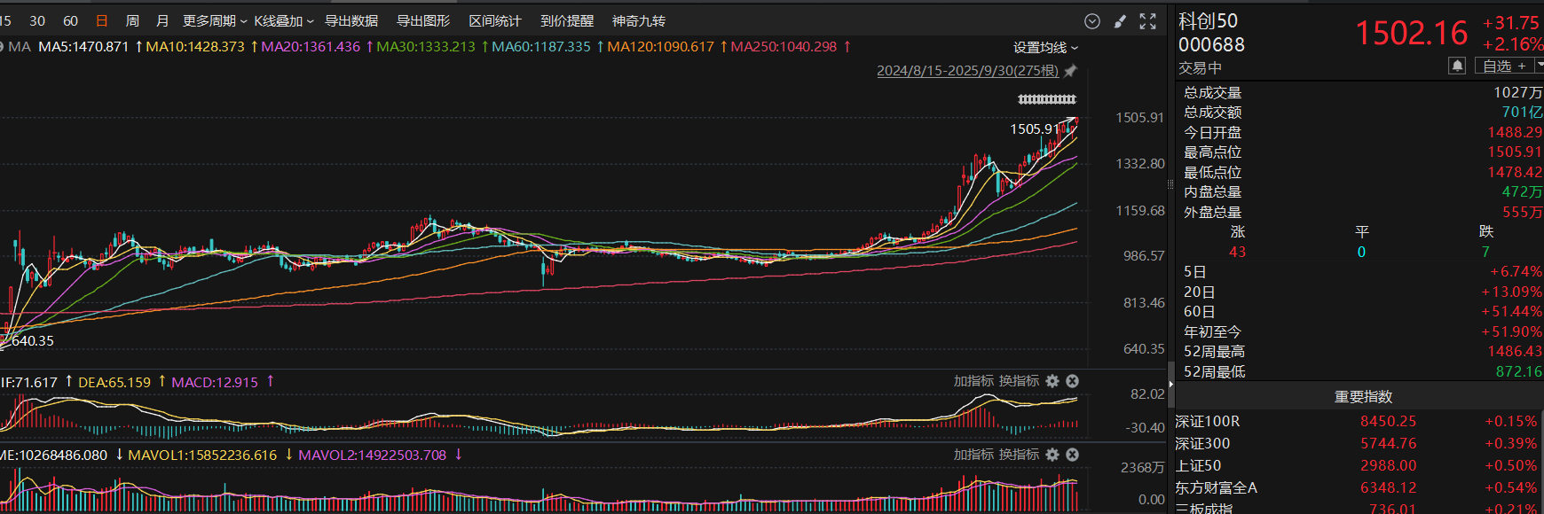 从技术面来看,科创板今天继续收中阳线,20日均线到250日均线都是多头排列,趋势比较健康,MACD的黄白线在0轴上方缠绕,说明目前主力还是多头思维