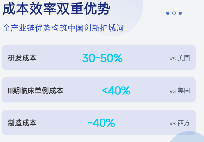 中国创新药具有显著的人力资源成本、临床试验成本、运营成本及全产业链优势,研发成本仅为美国同行的 30%-50%。