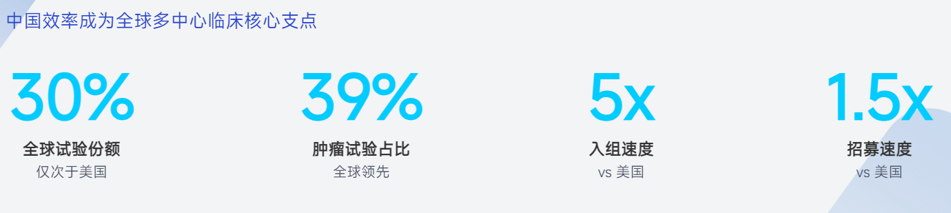 中国临床试验入组速度是美国的 5 倍,患者招募速度是美国的 1.5 倍。