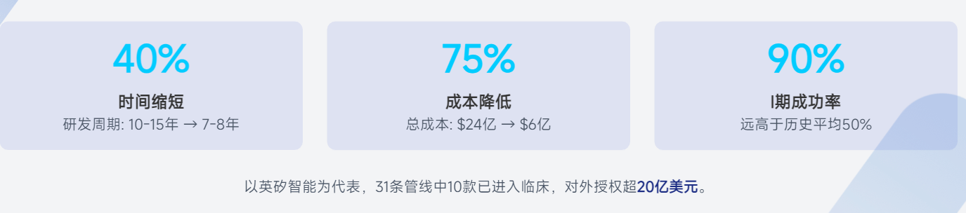 三是AI 赋能,重塑行业发展路径与成长格局,缩短研发周期、提高研发效率、降低研发成本、提升研发成功率。