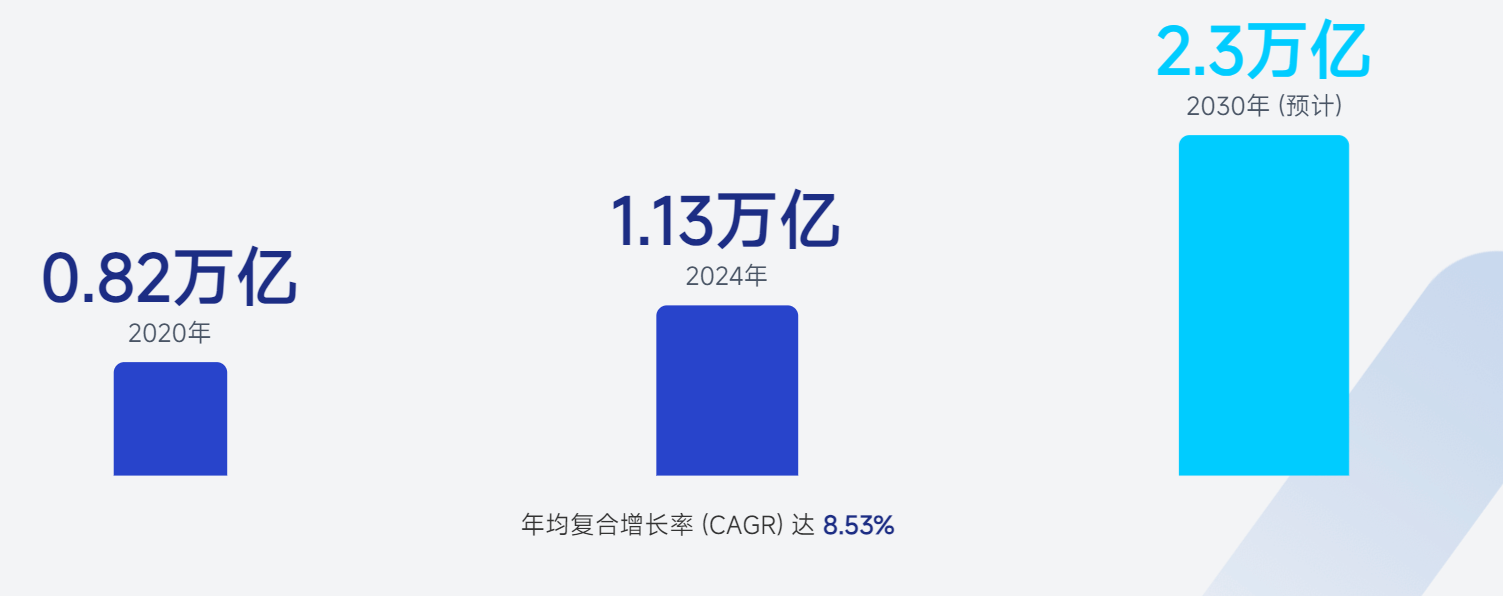 市场规模从 2020 年的 0.82 万亿元增长至 2024 年的 1.13万亿元,年均复合增长率达 8.53%,预计 2030 年将达到2.3万亿元。