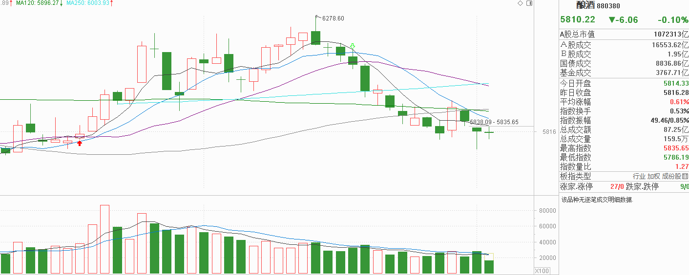 家人们,看看白酒!白酒昨天一度中阴调整创本次下行的新低,尾盘探底回升说明8月平台是承接的。如果白酒的抛压已经消除,昨天这么长的下影线,承接力是不少的,今天继续向上反弹是合理的,起码5天线能收复再测试年线压力。但今天白酒只是窄幅震荡,没有继续上行,只在昨天下影线的区间内震荡,只能说昨天的承接盘只在8月平台里防守,没有向上进攻的意愿。我认为白酒维持在8月平台箱体波动问题不大,但要出现反弹,必须出现资金的流入信号。9月29号白酒一度出现过中阳反弹,结果就只有一天的表现,如果这一次出现资金流入也只有一天表现,相信会吸引到更多的筹码继续流出。所以白酒真要走好,其实很简单,弄两根中阳线突破年线就很靠谱,如果还是出现一根阳线就没有后续,我的建议是远离这个弱势品种,说不定有一些我们不知道的消息在影响白酒走弱,别看白酒在低位,风险一点都不少。