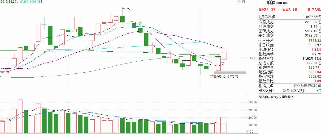 家人们,看看昨天白酒是怎么表演的!中阳反弹回到年线附近,5天线、10天线均已修复,走势与9月29号区别不大,仔细看29号还能收复60天线,昨天反弹遇上60天线是冲高回落,从强弱角度看,我认为29号的阳线力度更大一些。今天白酒依然围绕年线波动,并不像9月30号那样小阴调整,相对来说是强于预期的。也就是说白酒昨天的反弹目前还没有出现新抛压,至于有没有新资金流入,从目前是看不出来的,我维持昨天白酒继续在年线附近波动的观点不变。我还是挺担心白酒做多没有持续性。要改变市场的预期必须用资金说话,比如尾盘白酒继续中阳反弹把还在下行的60天线、20天线、半年线都反包了,我就认为白酒已经走出困境开始走好,别看白酒连续大涨两天后再看好是追涨,问题是前期单根中阳线参与的话,其实还是吃亏的,投资的第一要义是资金安全,不要在下跌趋势时抢反弹。