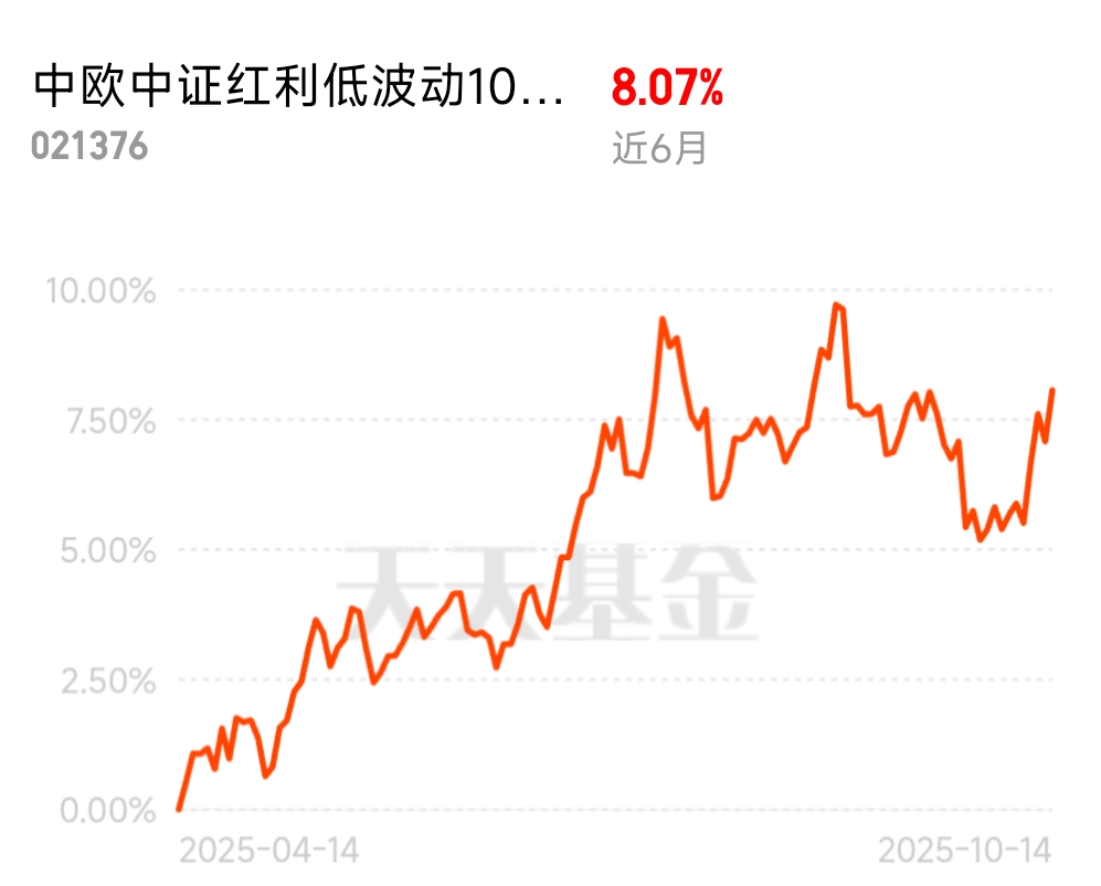 贸易摩擦又升级了,昨天市场跌得不少,情绪明显还没稳住。也就红利指数逆势飘红,跟科技板块正好错开,对冲效果特明显。这时候配点底仓很关键,中欧中证红利低波动100指数C近6个月涨了8.07%,国家队都在买,详情页还有15块红包,赶紧上车避险。