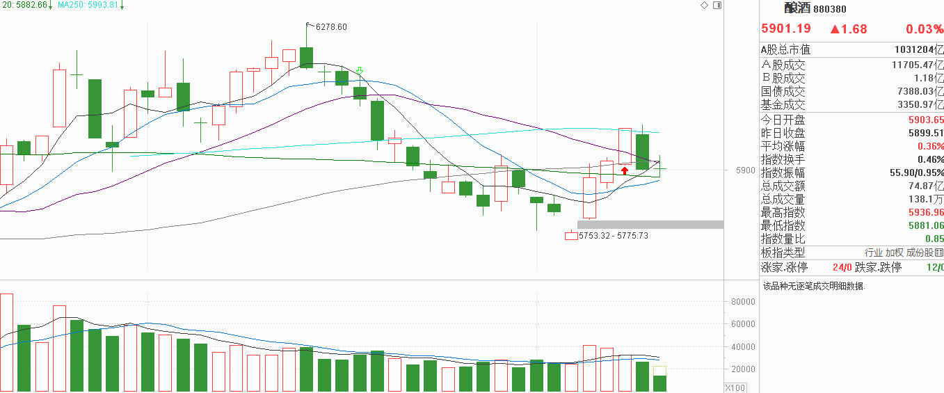 家人们,今天必须给大家好好剖析一下白酒,最近的表现有多么令人窒息!上周五低开后尝试重新收复半年线,但冲高回落还是大阴调整把上周四中阳线反包了,如果把上周四中阳线看成资金流入,则上周五的大阴线就是资金在流出,从力度看,上周五资金流出比较大。不过上周五白酒在技术上回踩5天线,短线还有走强修复的机会,毕竟三连阳资金持续流入在上周五并未打断。今天白酒在市场普涨的情况下也有小阳反弹,不过冲高回落,60天线、20天线有阻力,10天线与年线有支撑,最关键的5天线反倒是失守了。如果上周新增资金持续流入掌控了盘面,我觉得今天白酒应该要以更大的中阳反弹把周五的大阴线反包,只要这样才能确认做多志愿的坚定。今天白酒在市场情绪回暖的情况下反而没有表现,我认为是不及预期的表现,止跌有余,反弹不足,先看横向震荡,继续在低位10天线与半年线的狭窄区间内波动可能性较大,由于市场波动空间不够,看震荡也没啥吸引力。