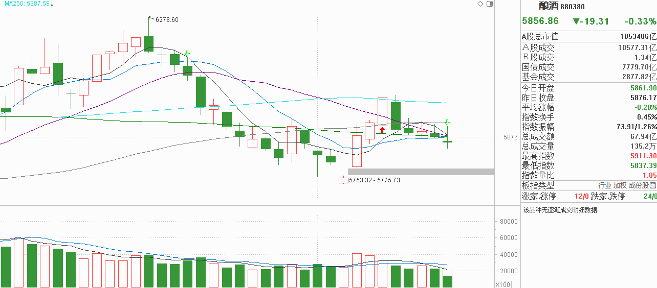 都看看白酒啊!昨天冲高回落小阴调整,因为还在年线上方震荡,我认为是正常的表现,当然由于白酒长期没有改变趋势,当然不会有看好的想法,所以细节上还是有忽略,我没有发现白酒本周三天都是冲高回落上影线,而上周五白酒受半年线影响中阴调整,上影线说明阻力所在,震荡市的情况下上影线多次明确,虽然上周白酒有三天资金在流入,再次探找支撑还是必要的。今天大幅低开在10天线下方感觉是开启探底的信号,结果一度冲高至60天线,原以为白酒这次是新资金流入的第二波,结果主力跟你玩了二次诱多,还是冲高回落且上影线非常长,这一次上影线形成的时候,白酒已经失守近期所有均线,更为符合遇阻要寻支撑的技术要求。现在冲高回落倒灌式下行,当然是抛压第四次释放的体现。由于上周白酒的资金流入并没有改变趋势,如果做多资金无效,不排除也会加入流出行列。当下只能等待白酒二次探底确认。当然,白酒长期趋势没变,那怕探出支撑我也不会马上看好,要看到新增流入资金成功赚钱了才会跟随。