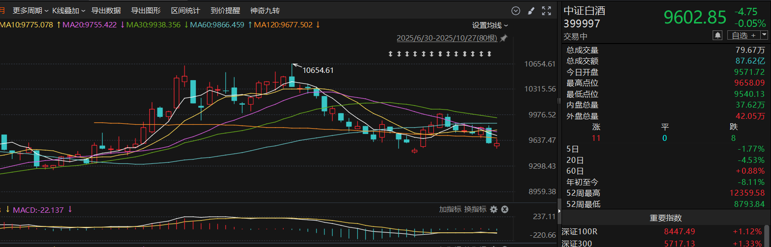 白酒今天微跌走势,主要是基本面还是没走出向下的趋势,但我觉得股价是领先基本面的,等基本面好转了再进可能已经来不及了