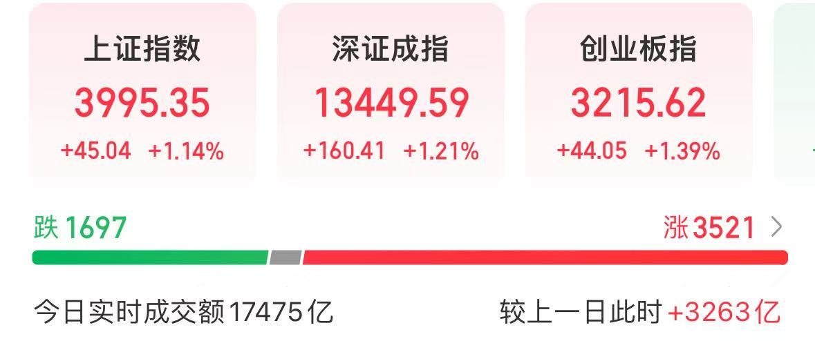 盘面上,截至我发文,上证指数上涨1.14%,深成指数上涨1.21%,创业板指数上涨1.39%