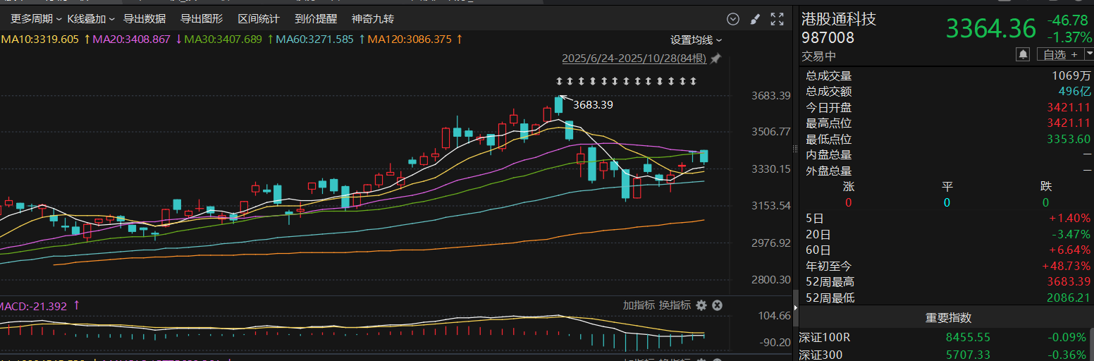 港股通科技3连阳,低位持续放量,场外资金逢低进场,从10月初以来港股通科技的回调幅度比A股更高,调整也更充分,情绪释放也更到位,相比之下A股已经突破4000点,创年内新高,所以我觉得港股通科技可能会出现补涨的行情。