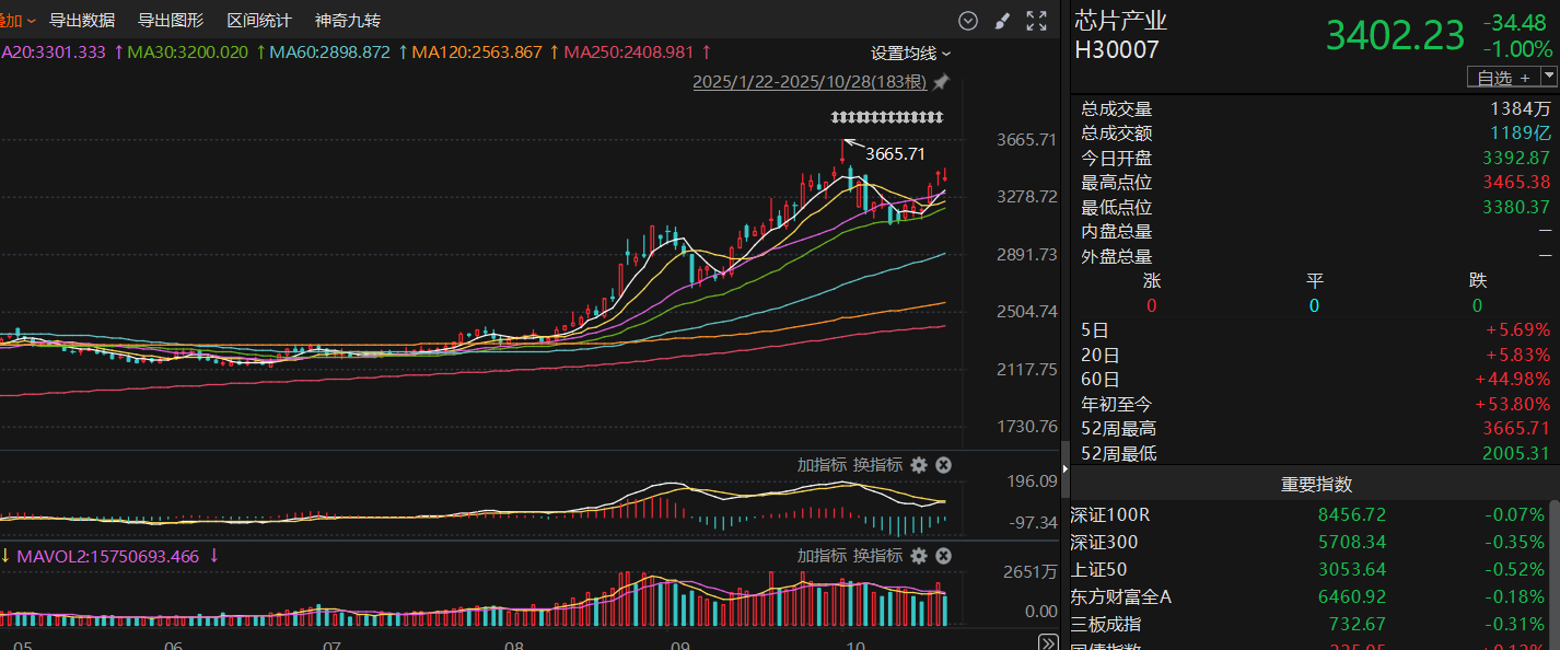 今天下跌走势,在前高处有点遇阻,那这个位置有可能形成一个压力位,现在芯片是上有压力,下有支撑,整体我觉得还是处于上升的趋势中