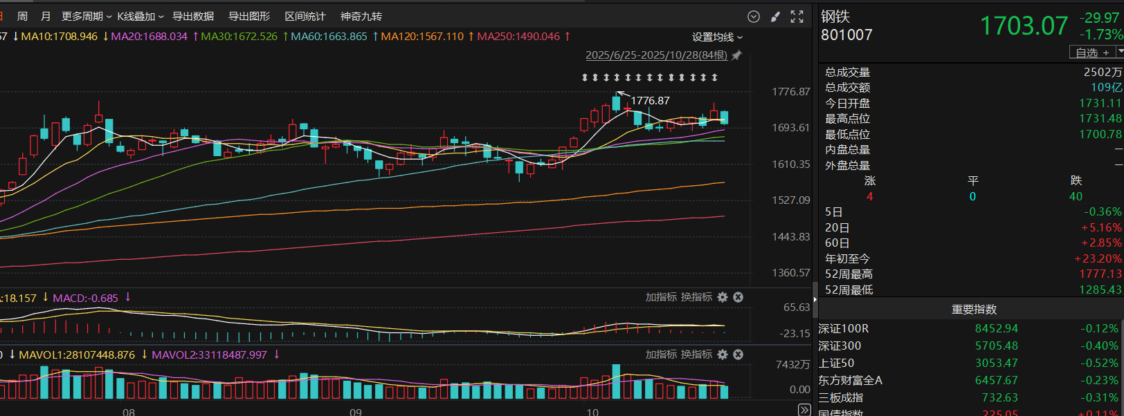 从技术面上,钢铁板块120、250日长期均线缓缓向上推进,长期趋势向好,昨天冲高,我认为是资金的向上试探,今天回落,在10日均线处获得支撑,短期我也是趁回落逢低布局。