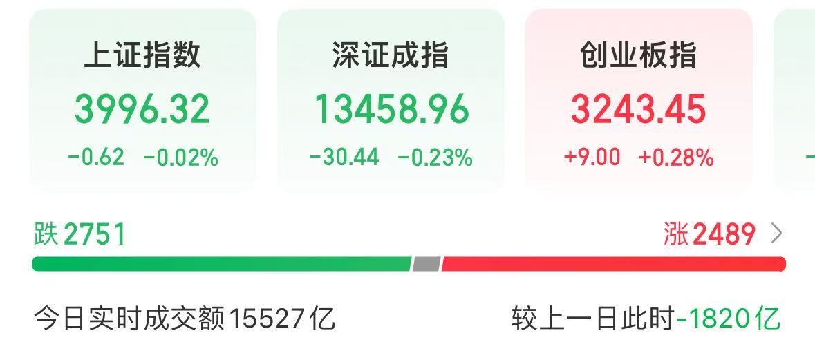 盘面上,截至我发文,上证指数下跌0.02%,深成指数下跌0.23%,创业板指数上涨0.28%