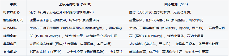 总而言之,全钒液流电池与固态电池是电化学储能的“两条平行线”:前者深耕“大规模、长时、安全”的地面电网储能,后者瞄准“高能量密度、小型化”的移动/便携场景。两者的发展路径独立,但共同推动储能技术多元化——正如张洪章的太空实验聚焦VRFB在极端环境下的材料优化,而固态电池的研发则致力于突破电动车续航瓶颈,最终服务于“双碳”目标与能源系统升级的不同维度需求。