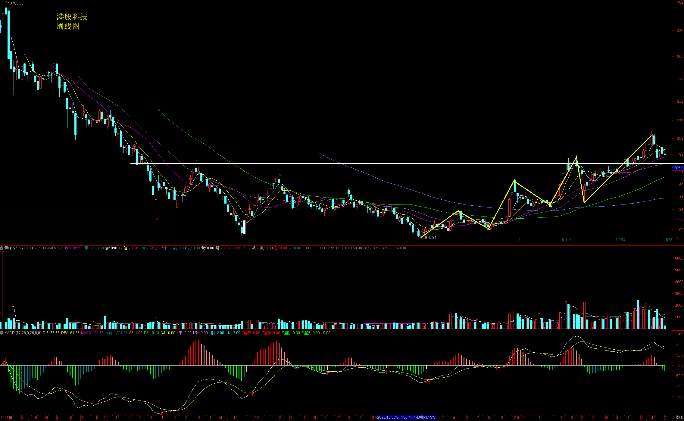周线形成大圆弧底,扭转了大级别下行趋势;白线处是强峰顶线与30周线形成的共振支撑位,有较强支撑力度,观察能否在此止跌。