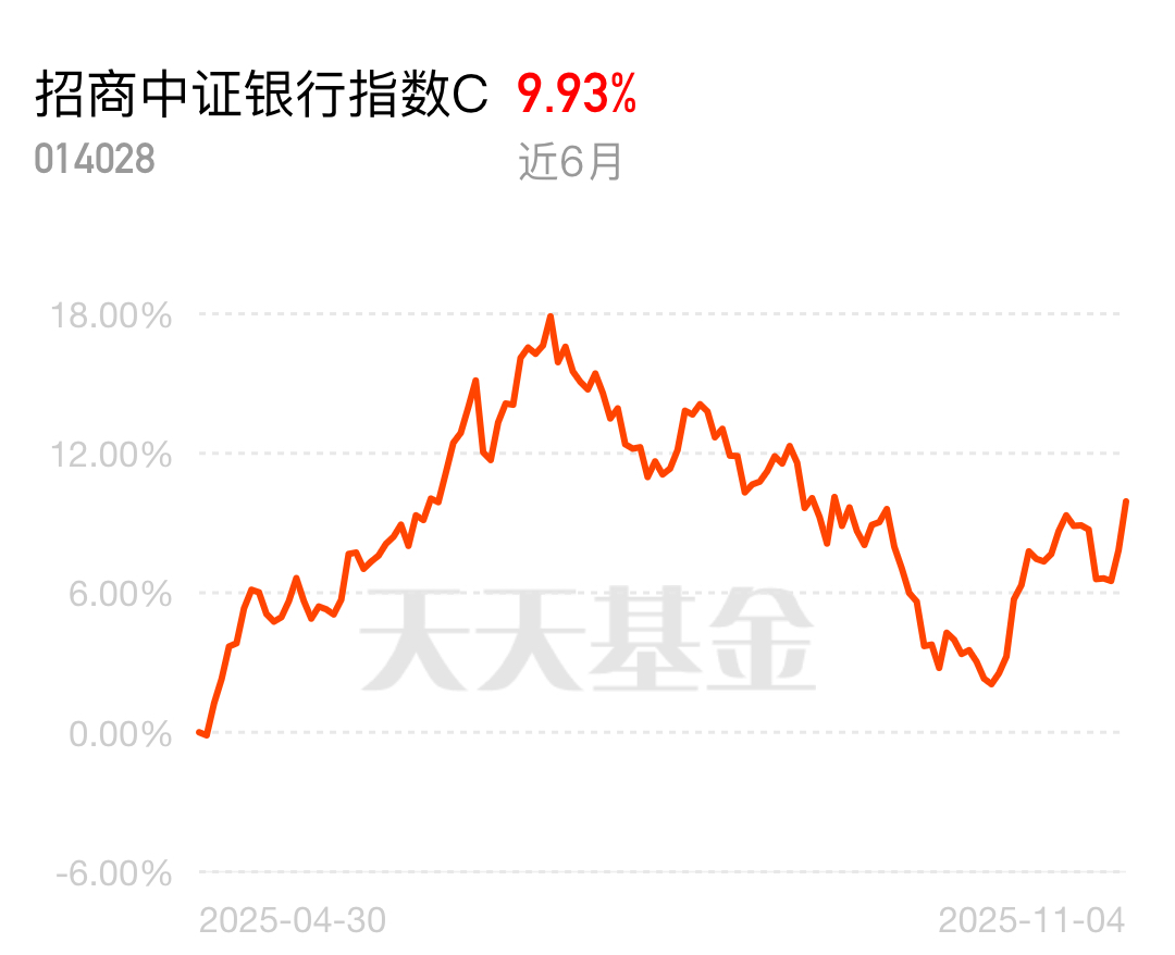 大伙选高股息资产都在比收益,港股无风险收益率4~5%,境内不到2%,A股银行吸引力更强。招商中证银行指数C挺靠谱,近6个月涨了9.93%,值得放进备选里。$招商中证银行指数C$